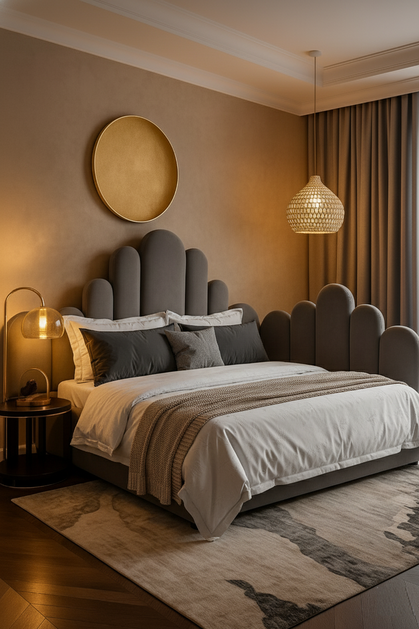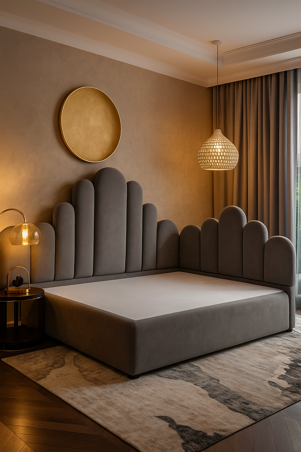 The Cloud Luxe Upholstered Bed brings elegance and comfort together with its unique scalloped headboard design and soft grey velvet finish. Perfect for premium interiors that radiate sophistication and calm.