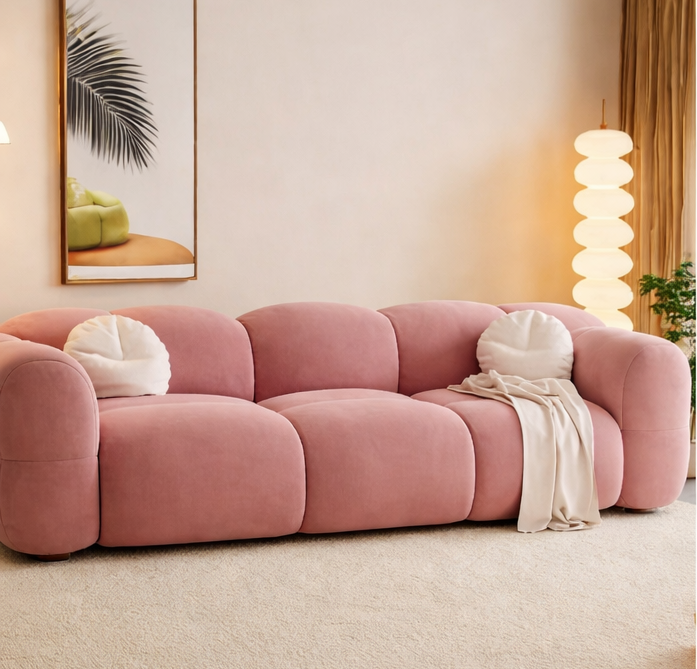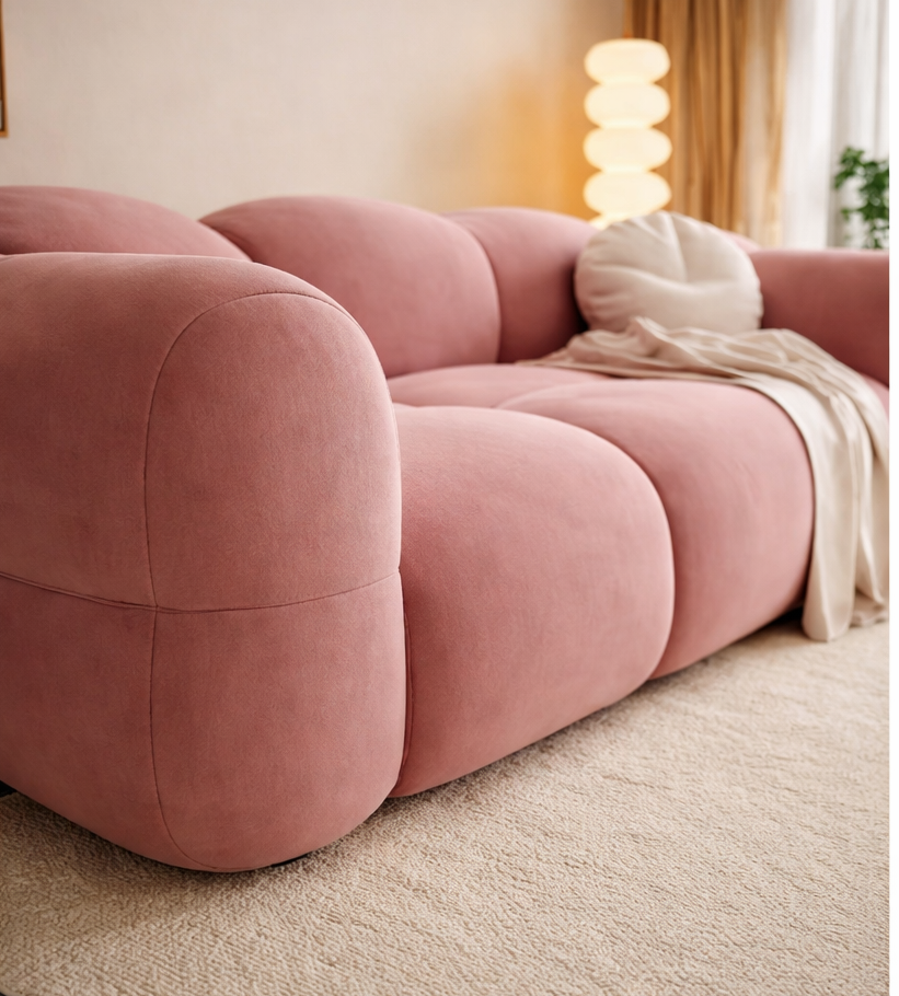 The Rosé Luxe Sofa is a statement of modern softness and sculptural elegance. Designed with plush, cloud-like contours and wrapped in a luxurious rosé-toned upholstery, this sofa transforms any living space into a refined comfort lounge. Its generously padded silhouette and seamless curves offer an inviting aesthetic while delivering exceptional relaxation. Perfect for contemporary homes, boutique interiors, or design-forward spaces, the Rosé Luxe Sofa balances visual drama with everyday comfort.