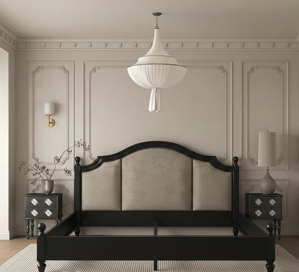 The Parisian Arch Bed captures the romance of classic Parisian design while being expertly crafted in India with premium materials and skilled workmanship. Featuring a graceful arched headboard with refined upholstered detailing and a contrasting wood frame, this bed brings timeless elegance and quiet luxury to the bedroom.